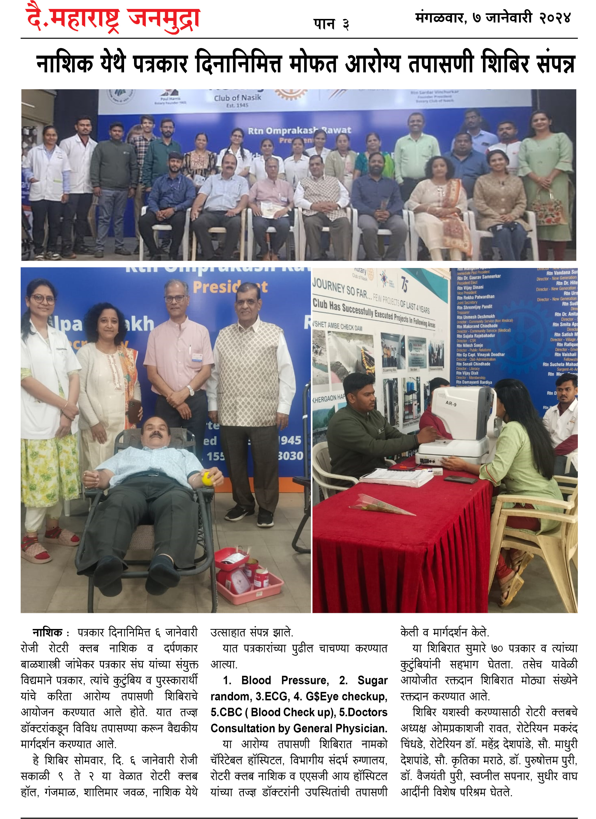 रोटरी क्‍लब नाशिक व दर्पणकार बाळशास्त्री जांभेकर पत्रकार संघातर्फे पत्रकार दिनानिमित्त पत्रकार व त्यांच्या कुटुंबियासाठी रोटरी क्‍लब येथे आरोग्य शिबिर व रक्तदान शिबिर घेण्यात आले.